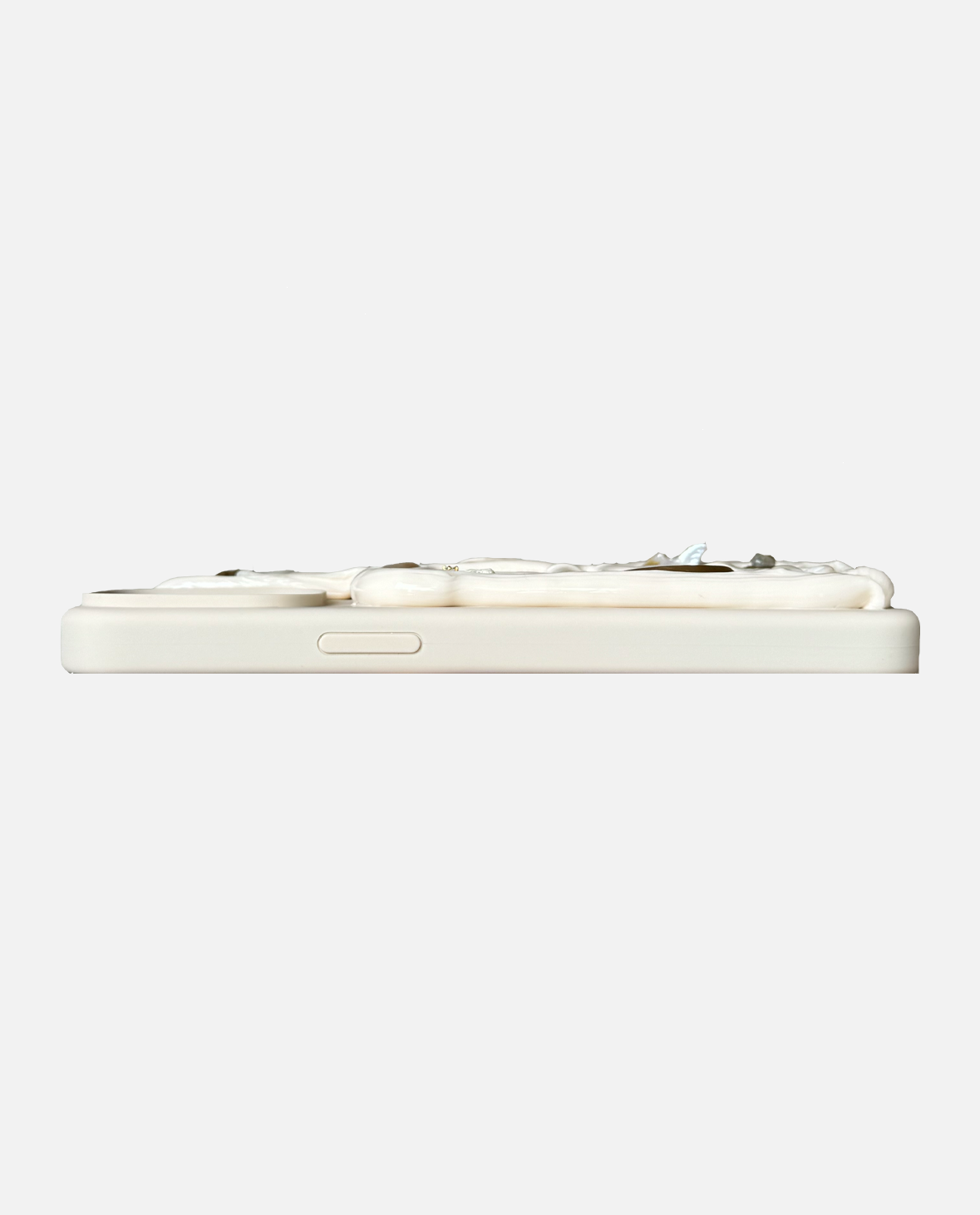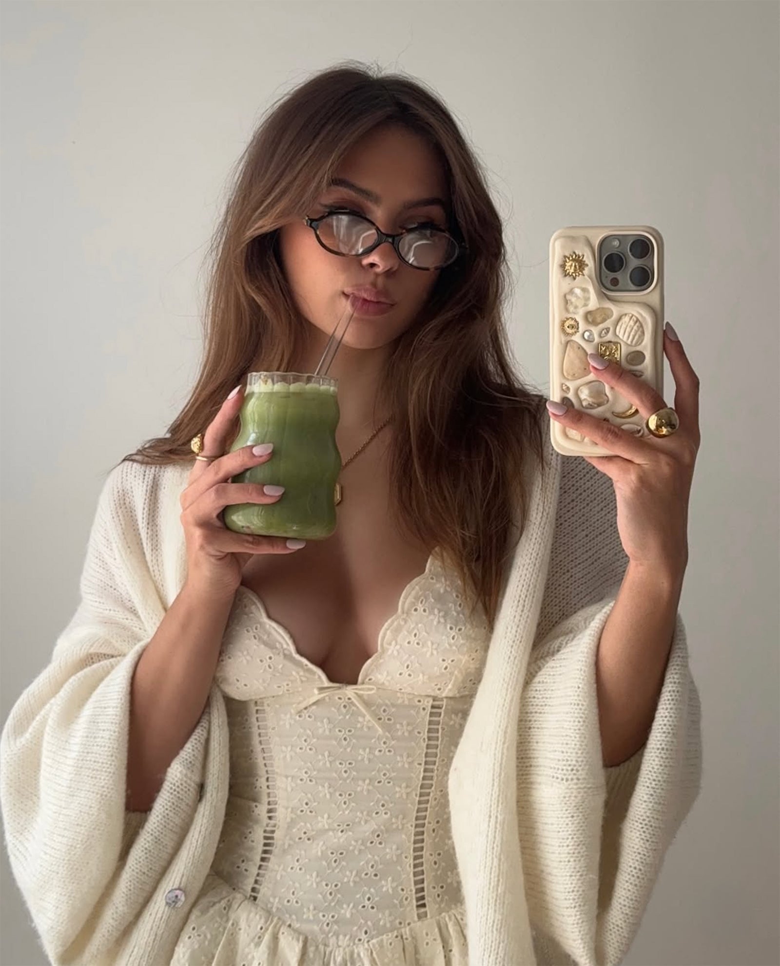 Phone cases adorned with shells, stones, and charms. To prevent damage, please avoid hard drops, picking, peeling, and water exposure. Metal pieces may patina over time. Please note that wear and tear is dependent on individual use.